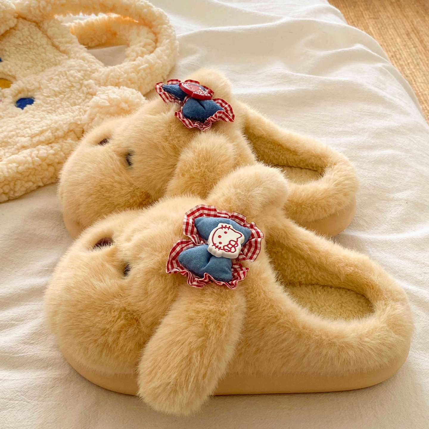 可爱长耳狗蝴蝶结棉拖鞋女款学生宿舍秋冬季室内保暖毛毛拖鞋外穿