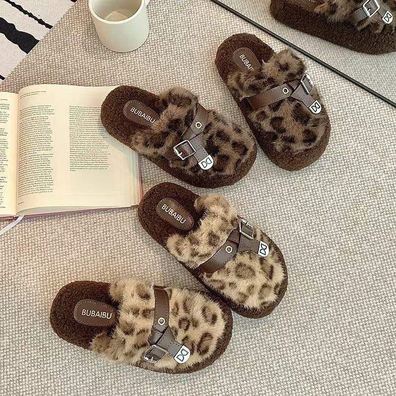 2025年时尚8829半包豹纹百搭外穿软底家居保暖毛毛鞋女拖鞋