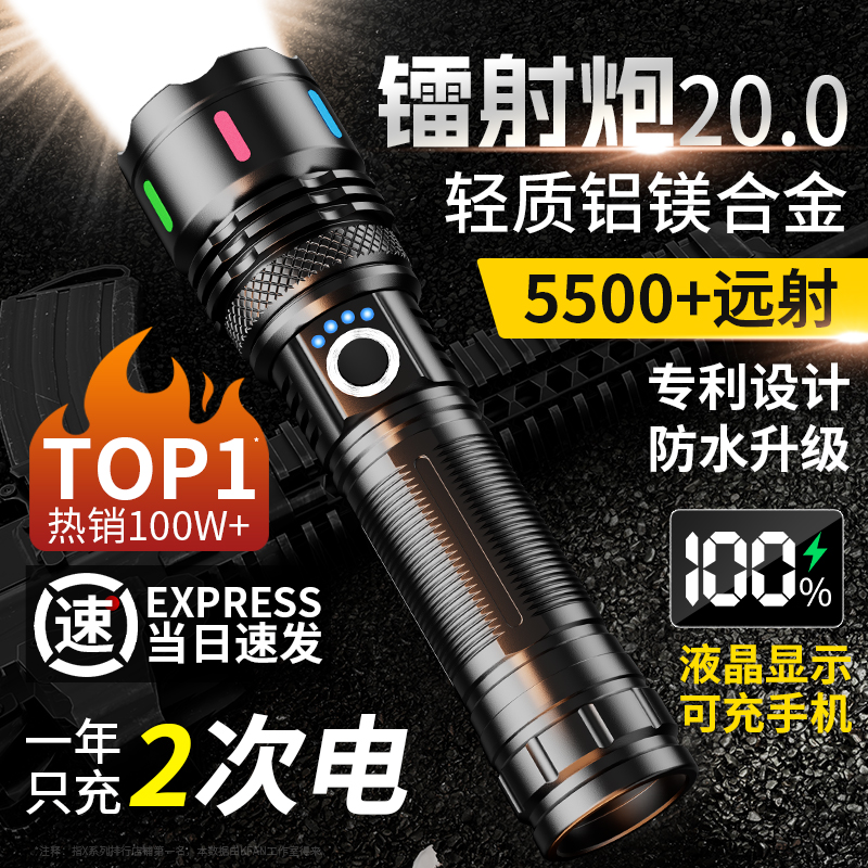 手电筒强光充电式小型便携户外远射超亮白激光多功能家用耐用巡逻