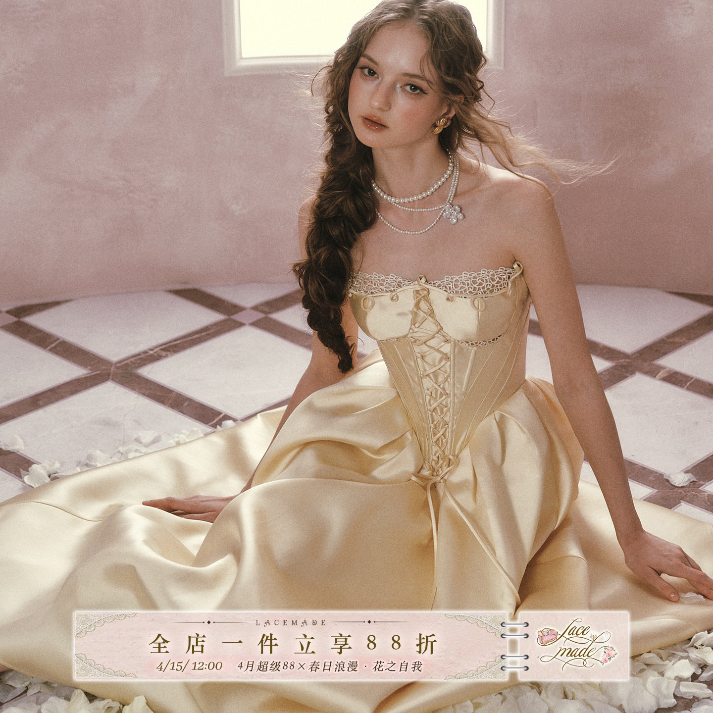 LaceMade 贝儿鎏金 法式设计感公主系列缎面抹胸蕾丝鱼骨连衣裙女