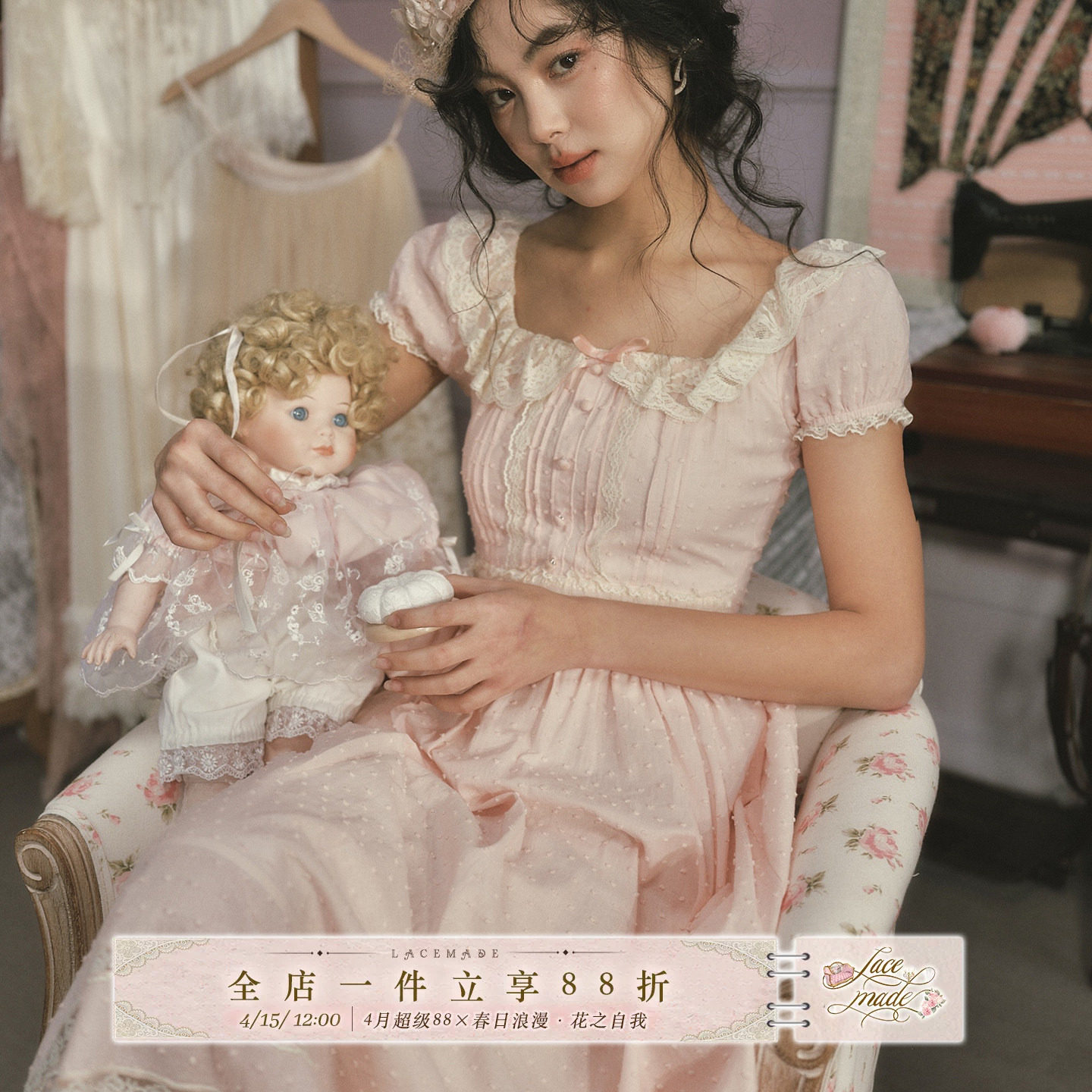 LaceMade 浓汤宝宝 法式甜美粉色公主裙蕾丝拼接方领长款连衣裙女