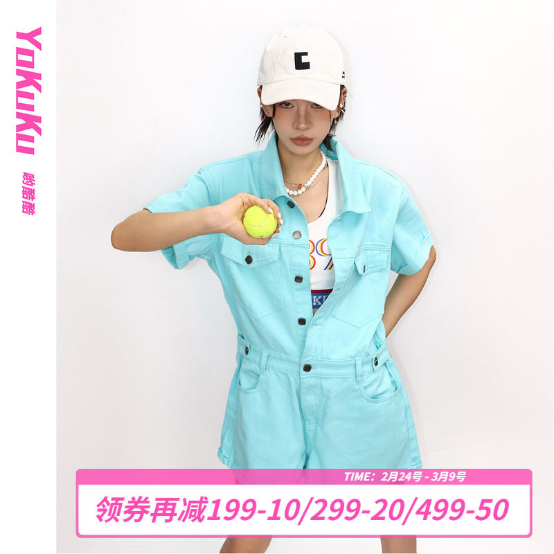 哟酷酷(街头腔调)夏季多巴胺美式街头连体衣裤女低腰牛仔短裤女