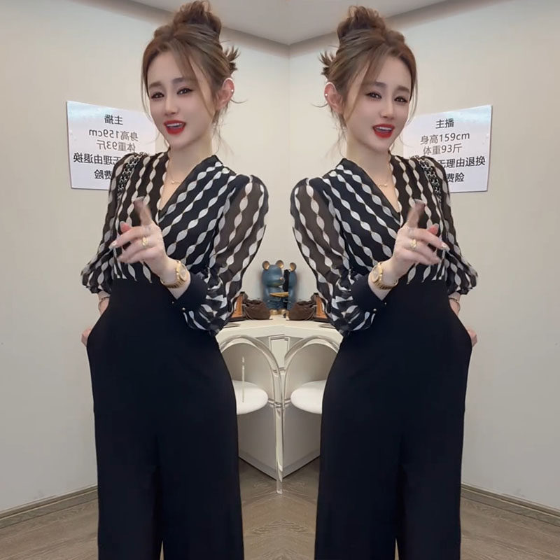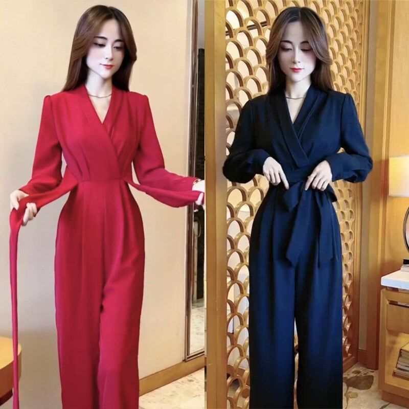 网红爆款时尚连体衣裤女2022年秋季新款韩版显瘦长袖V领阔腿裤潮