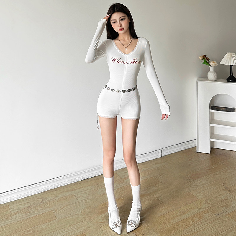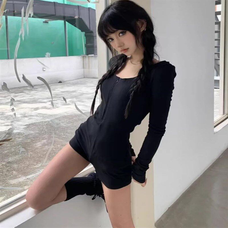 黑色美式长袖连体衣裤女秋冬2026新款纯欲风紧身收腰辣妹打底短裤
