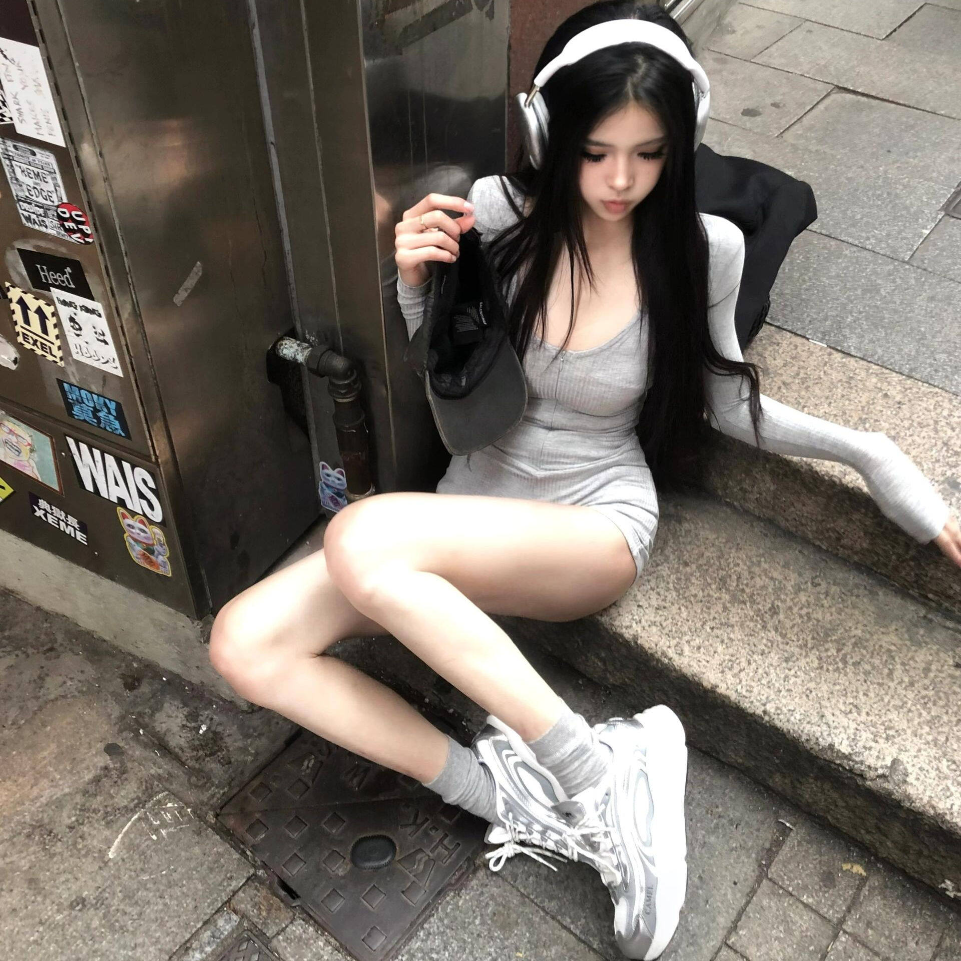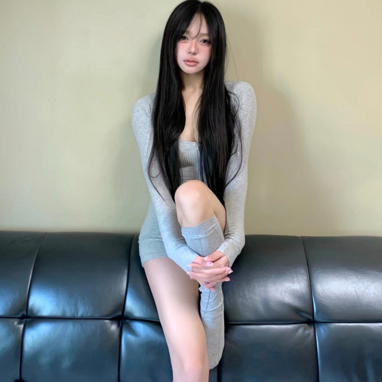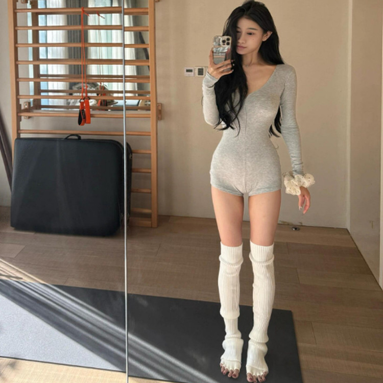 美式复古灰色V领长袖连体衣裤女秋冬新款修身显瘦辣妹包臀打底裤