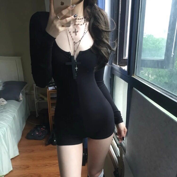 黑色法式纽扣长袖连体衣裤女秋冬新款辣妹修身显瘦包臀打底短裙裤