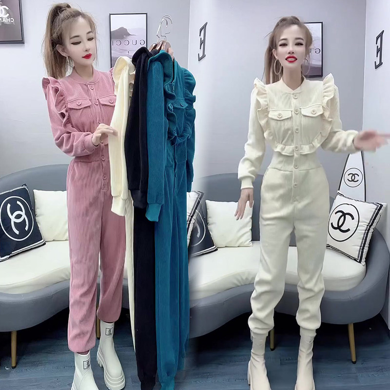 网红爆款时尚连体衣裤女2022年冬季新款韩版显瘦长袖荷叶边工装裤