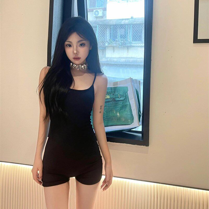 2025新款辣妹吊带连体衣裤女夏季黑色包臀休闲运动健身打底连衣裤