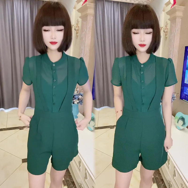 网红爆款时尚连体衣裤女2022年夏季新款韩版显瘦短袖拼纱连体短裤