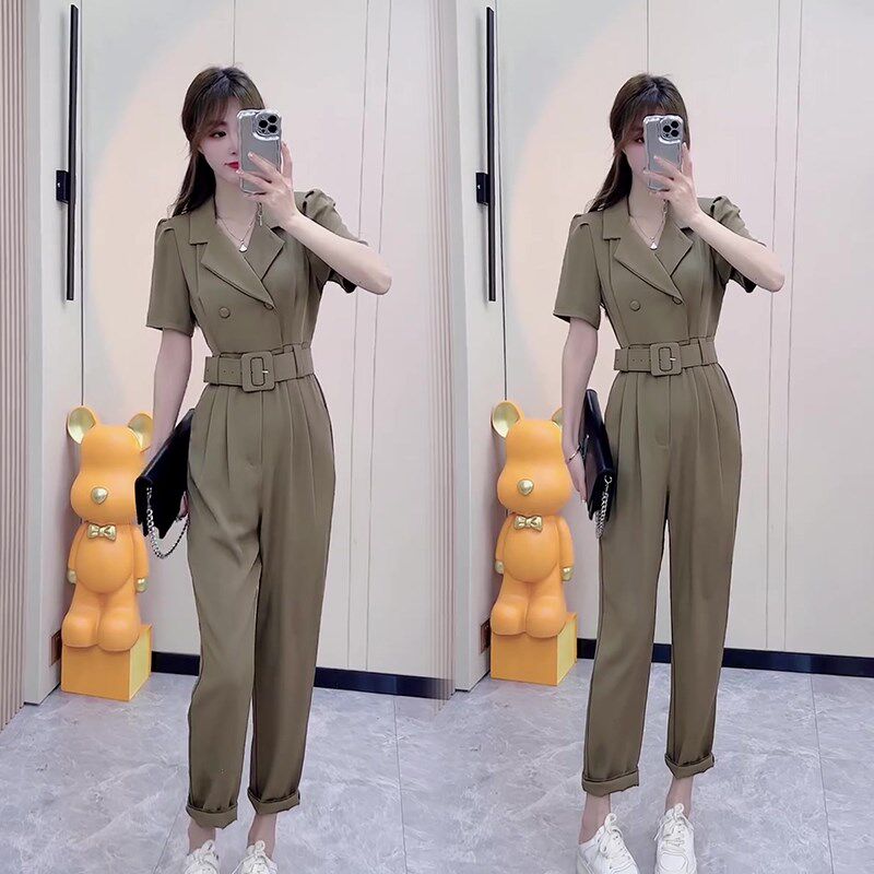 2023年春夏新款连体衣裤女韩版显瘦短袖西装领上衣连体九分工装裤