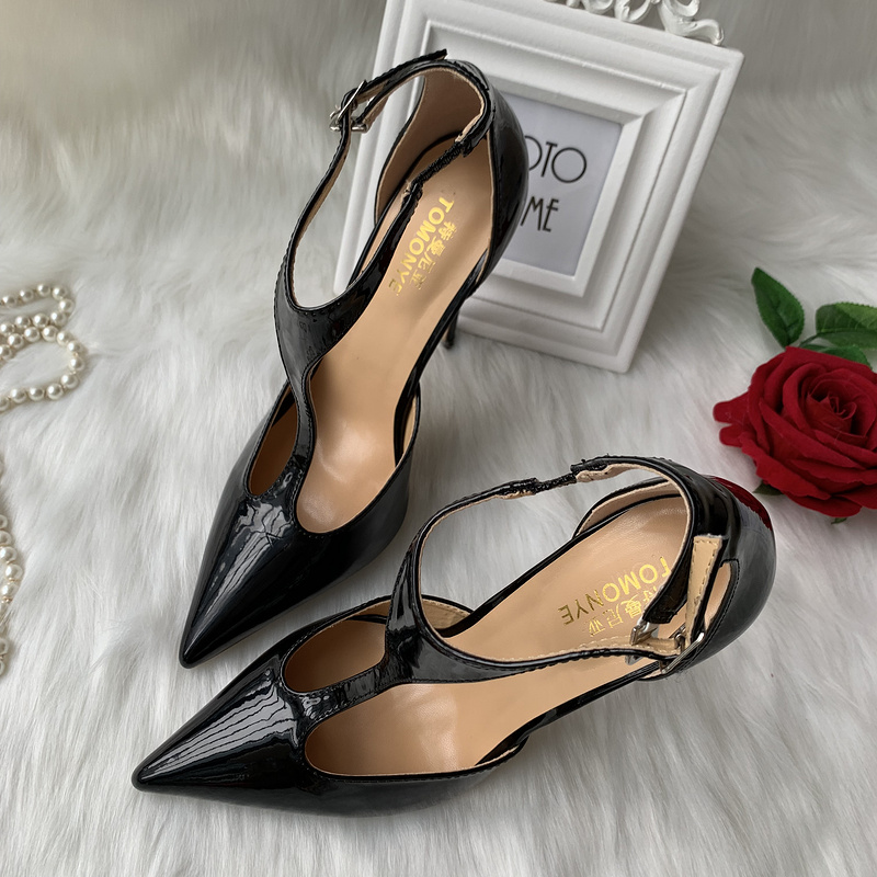 实拍黑色漆皮T带包跟夜店性感12cm超细跟尖头宴会欧美高跟凉鞋