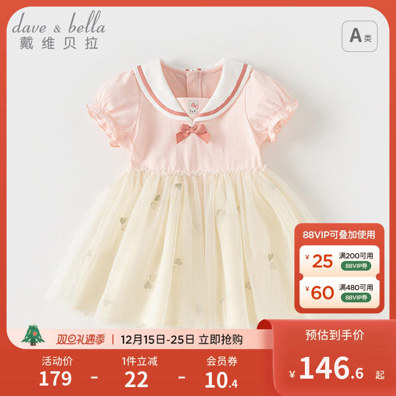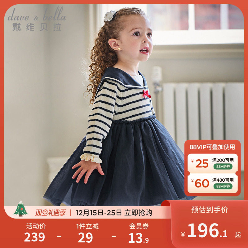 戴维贝拉2025秋装新款女童毛衣连衣裙儿童网纱裙宝宝海军风裙子