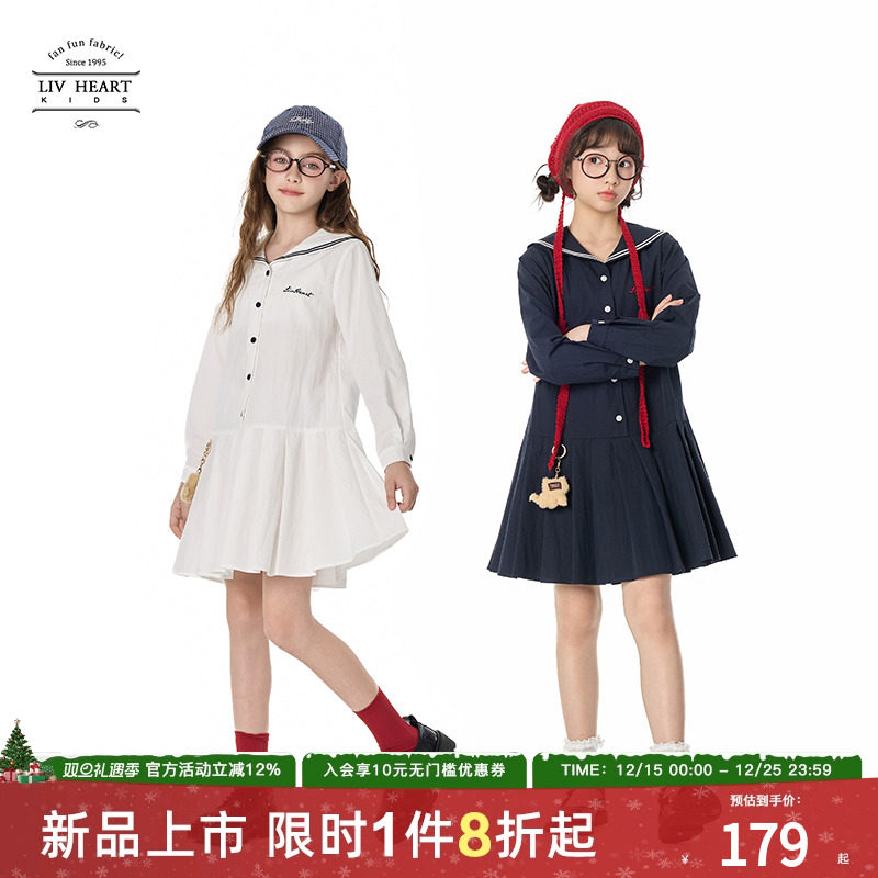 Livheart kids 学院风女童长袖连衣裙2025新款海军领女大童百褶裙