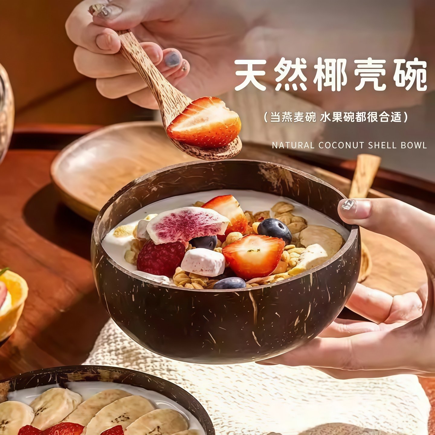 酸奶碗椰子燕麦天然椰子壳碗沙拉麦片甜品水果早餐餐具带勺木头碗