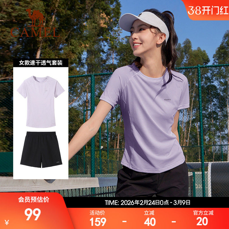 骆驼运动套装女夏季羽毛球服跑步休闲训练健身短袖上衣短裤速干恤