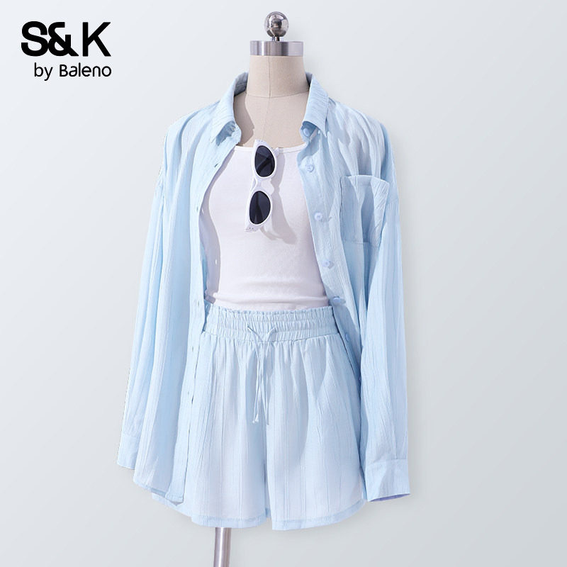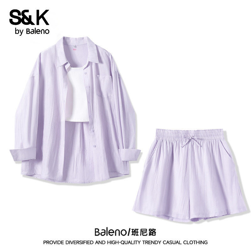 班尼路S&K系列夏季新款套装女休闲短裤时尚衬衣长袖衬衫两件套女Q