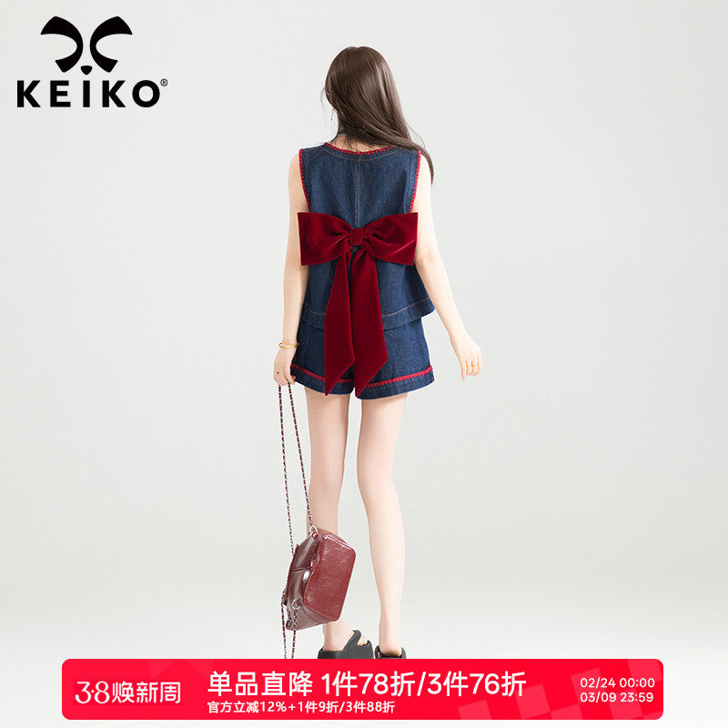 KEIKO 鬼马少女感牛仔套装夏季减龄蝴蝶结刺绣v领背心+短裤两件套
