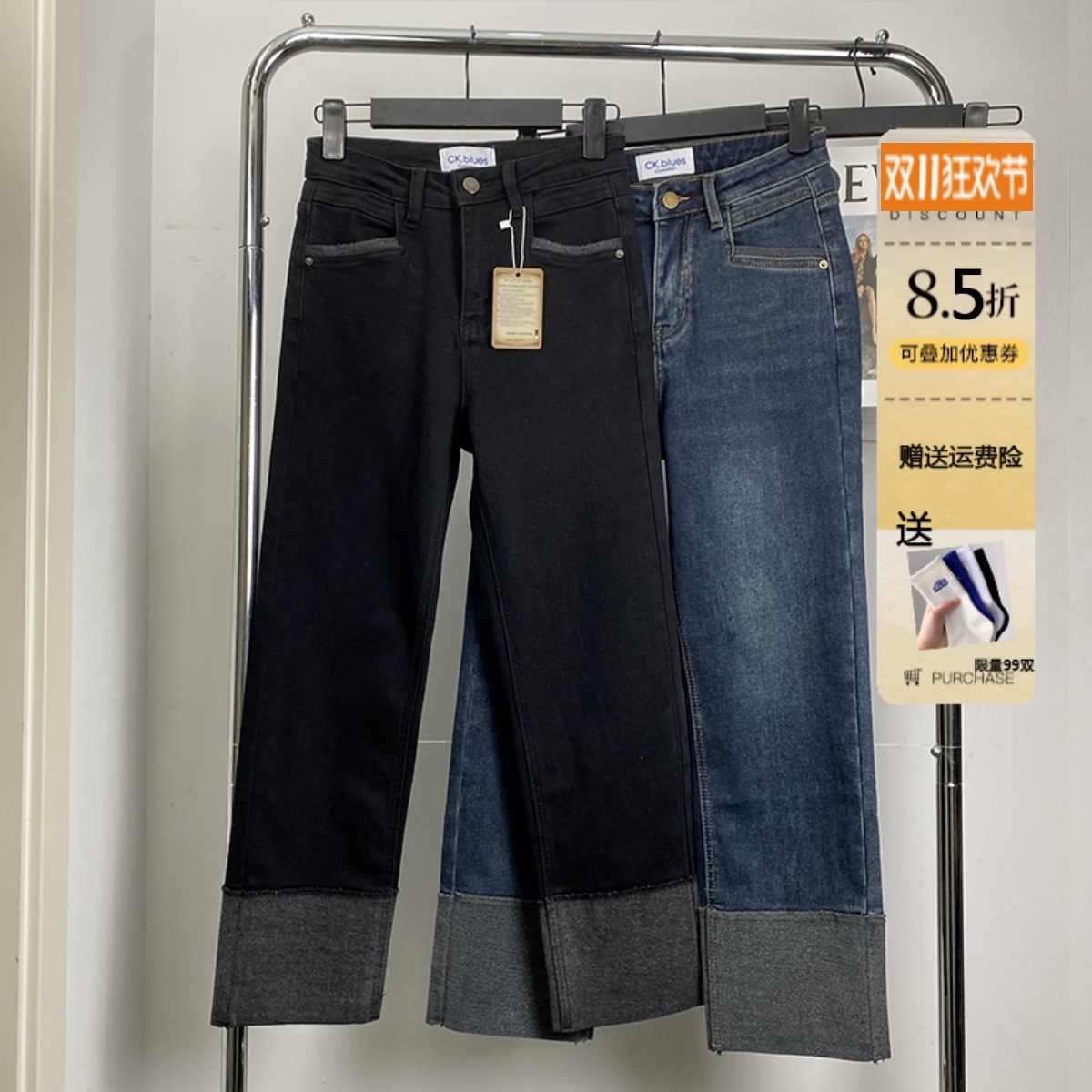 百斯盾官方女装牛仔裤25年秋冬新款小个子时尚翻边九分显瘦直筒裤