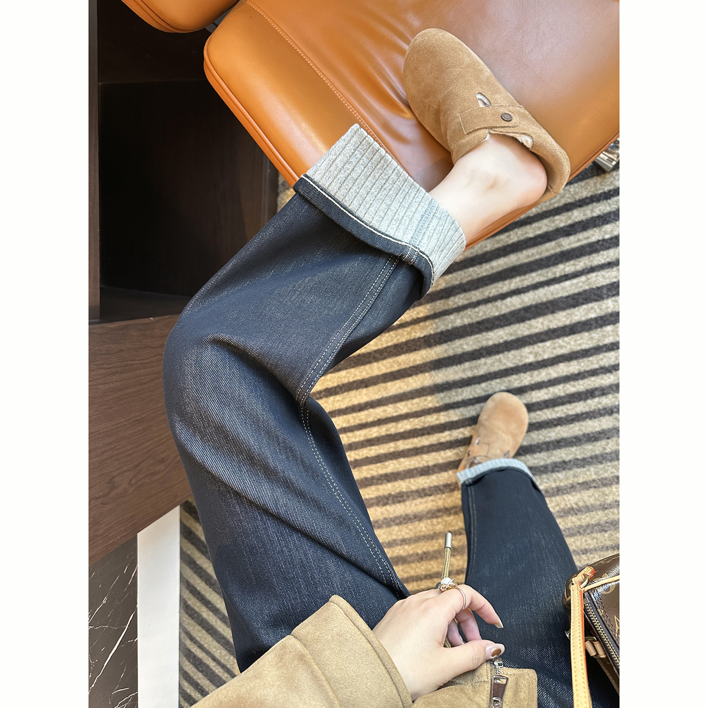腿型加分!~两穿翻边直筒牛仔裤女秋冬加绒加厚小个子宽松九分裤