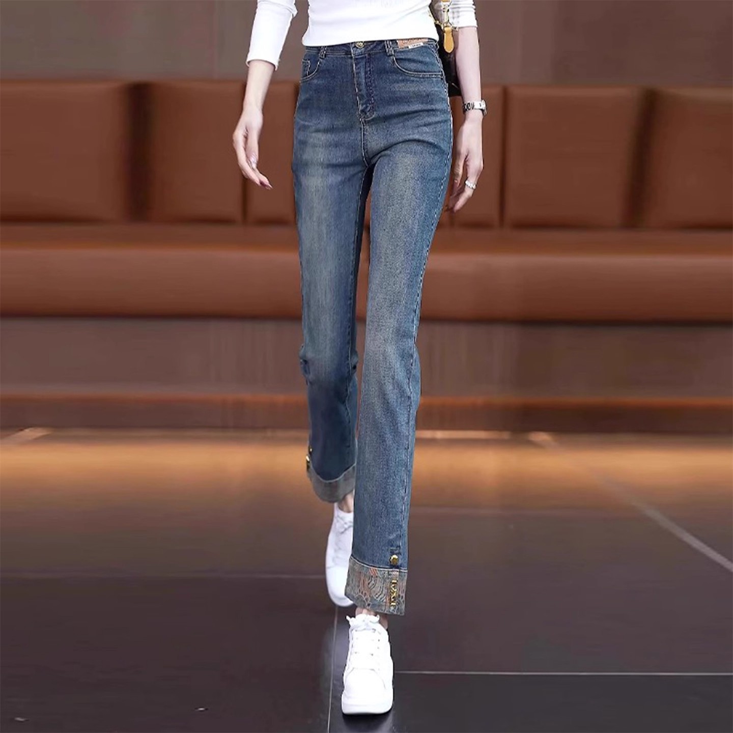 九分牛仔裤女2025年春季新款弹力高腰显瘦欧货烫钻翻边直筒烟管裤