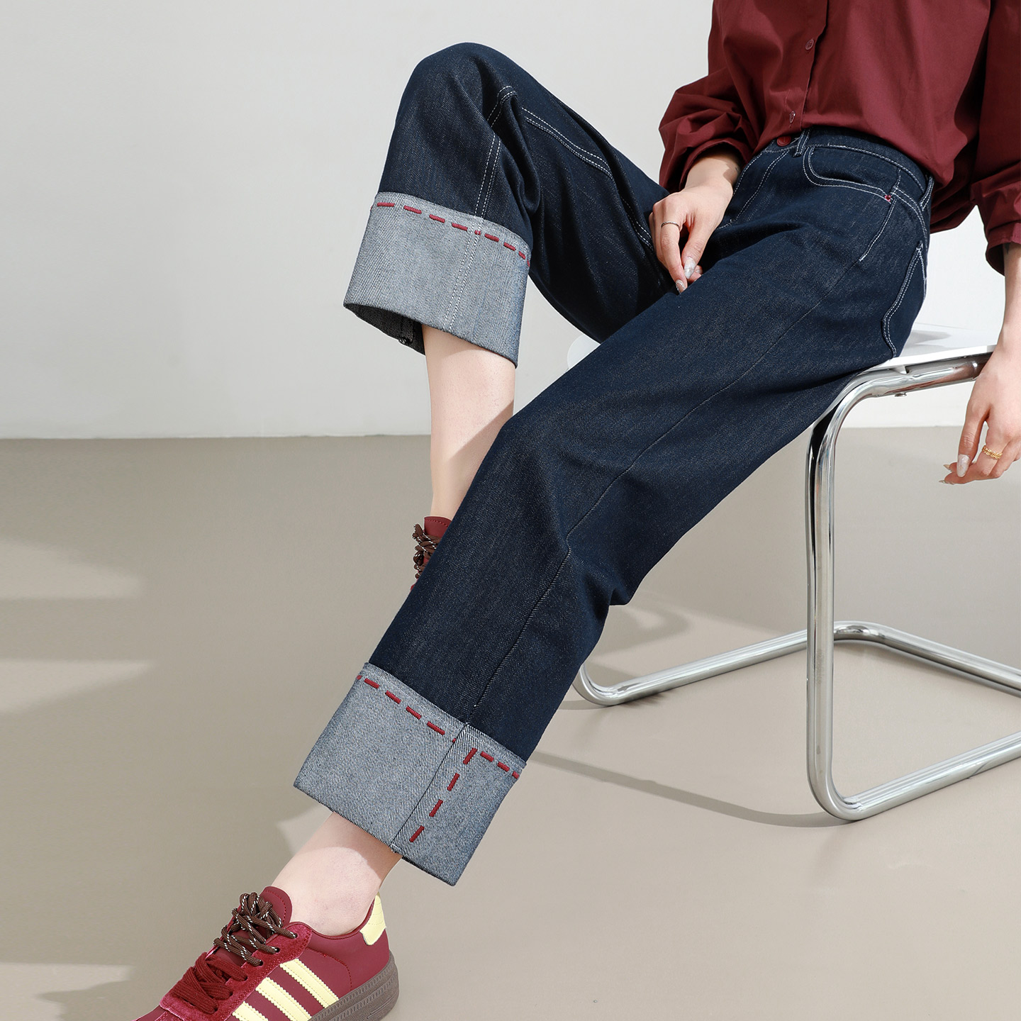 逸阳宽边直筒深蓝色九分翻边2025秋季新款修身显瘦烟管牛仔女裤子