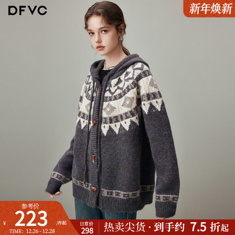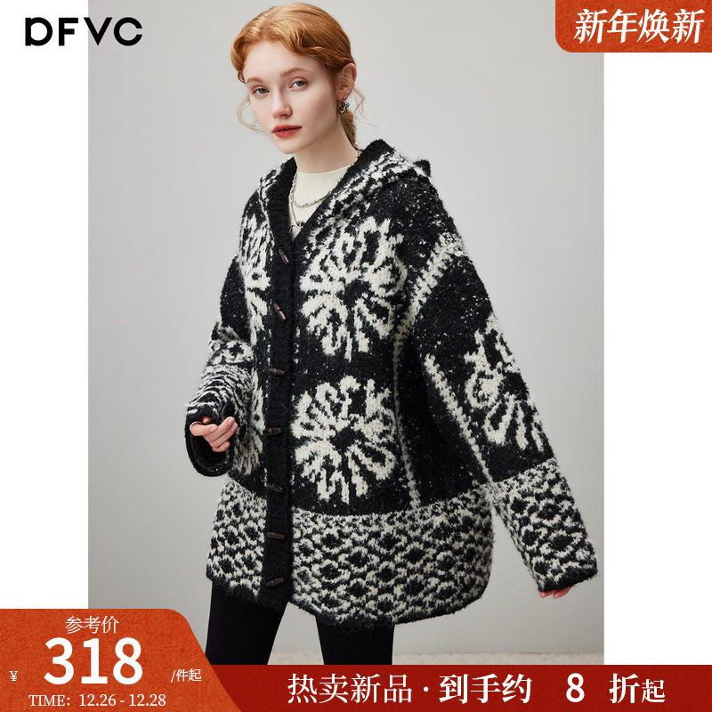 dfvc复古提花中长款连帽毛衣女2025年冬季新款牛角扣宽松针织开衫