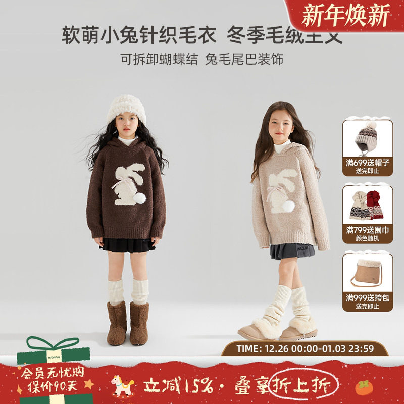 女童美拉德风连帽毛衣中大童针织衫中长款圈圈纱毛衣裙休闲外套潮