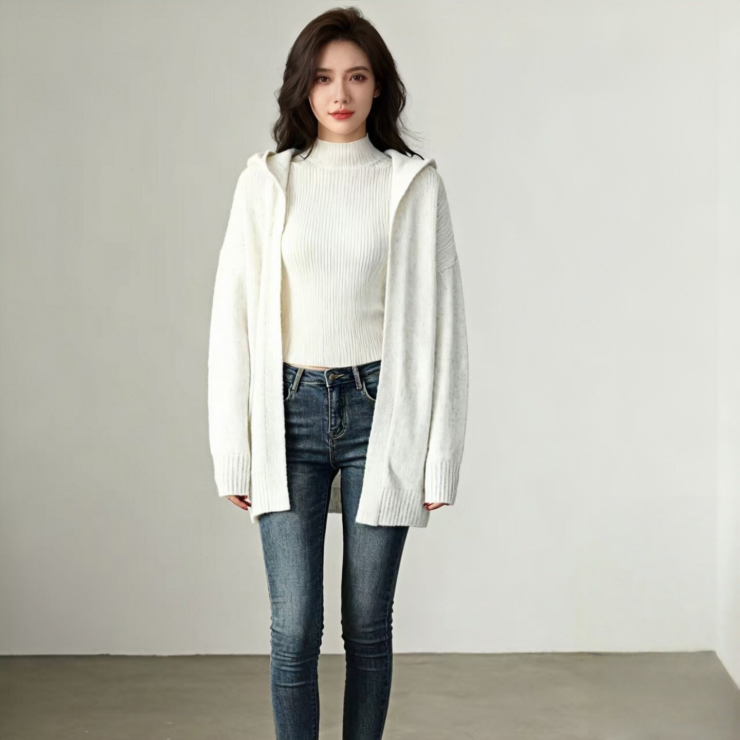 2026秋冬连帽针织开衫女宽松慵懒风软糯毛绒感加厚中长款毛衣外套