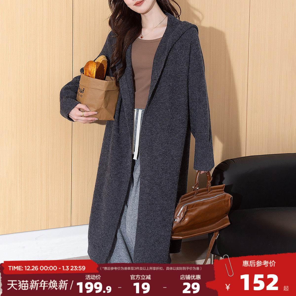 Basic House/百家好羊毛连帽针织开衫女冬季高级感中长款毛衣外套