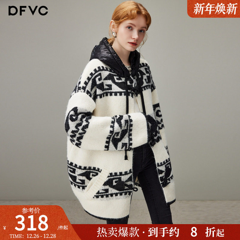 dfvc费尔岛提花中长款针织外套女2025年冬季新款连帽宽松开衫毛衣
