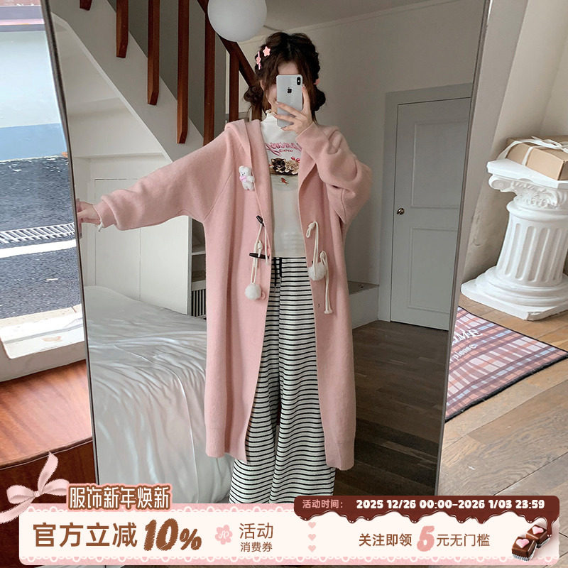 织物猪 粉色绵绵 中长款开衫外套女秋冬温柔慵懒风宽松连帽毛衣