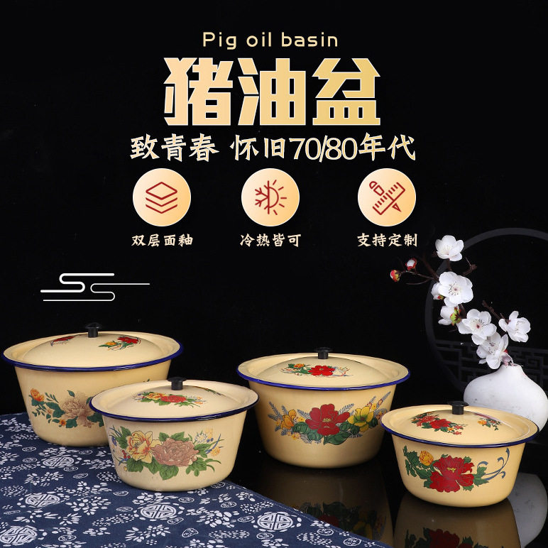 加厚搪瓷盆老式怀旧猪油盆网红蛋糕盆带盖家用和面盆拌馅盆熬药盆