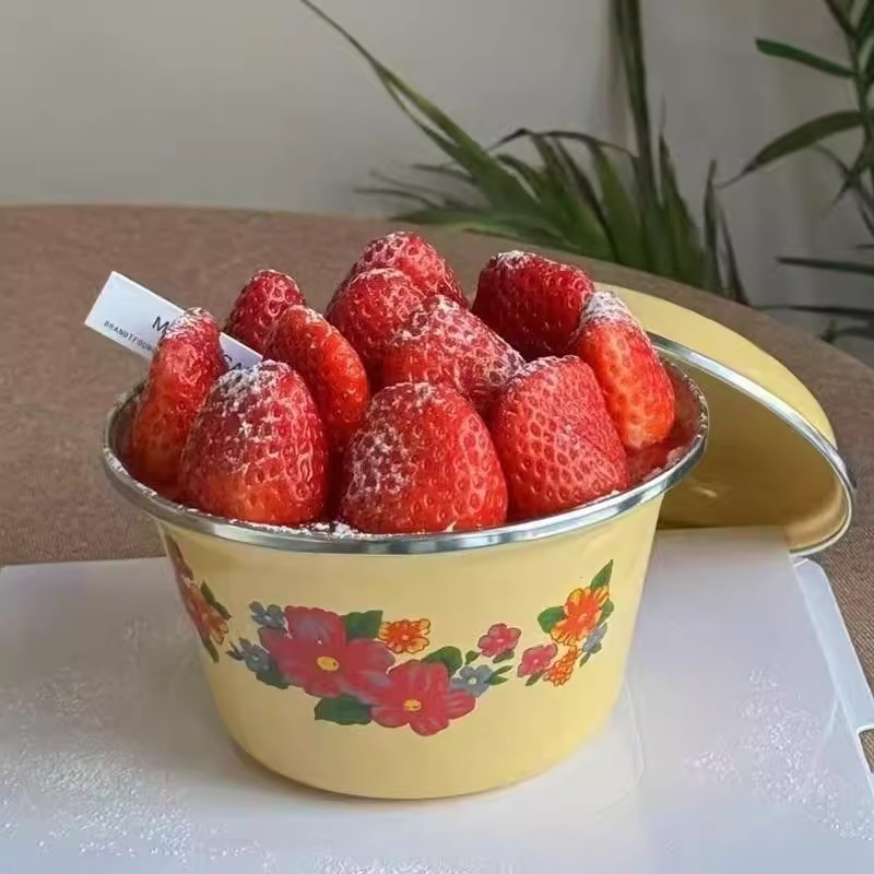 网红草莓蛋糕搪瓷盆大红花复古黄色猪油盆蛋糕盆草莓生日蛋糕装饰