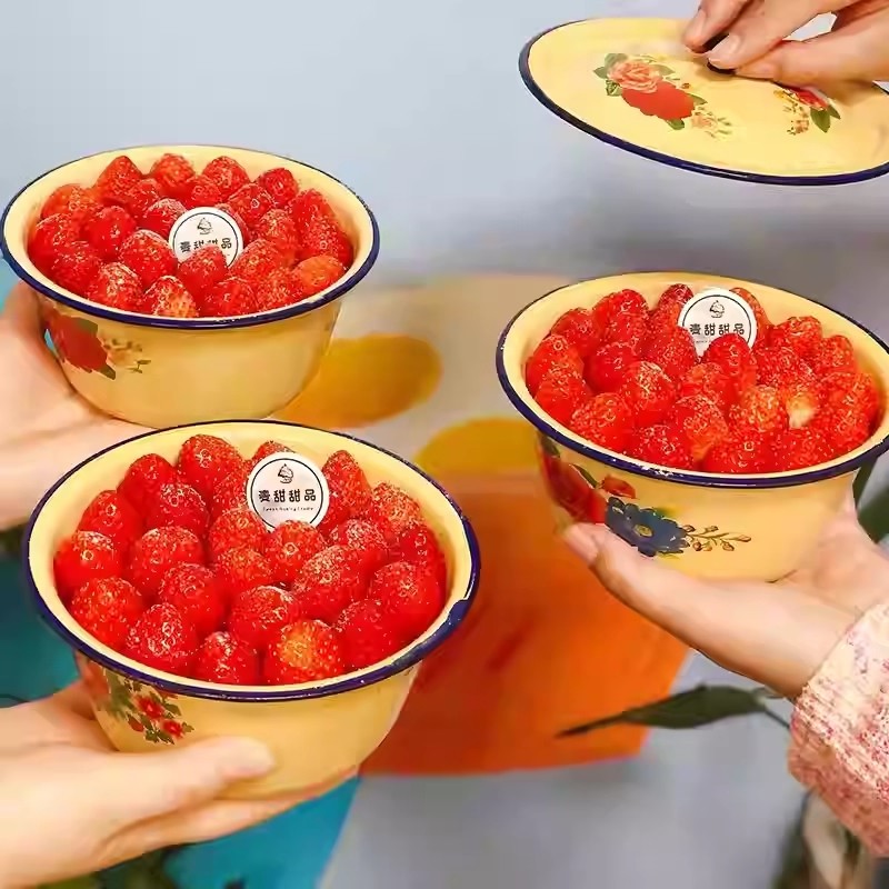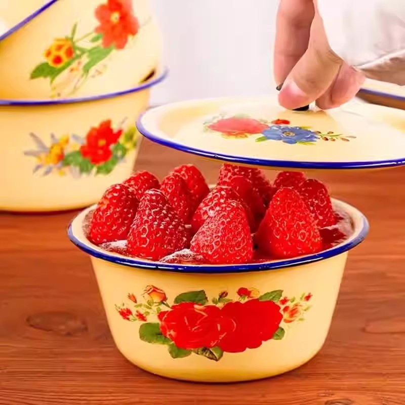 搪瓷盆草莓蛋糕盆碗调料盆老式复古盆带盖黄洗手碗14-30cm 猪油盆