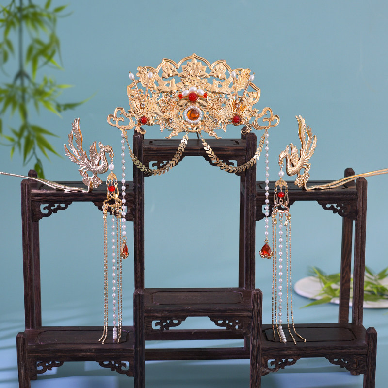 明制汉服配饰秀和服红色金色华丽步摇发冠发钗套装百搭凤来朝超仙