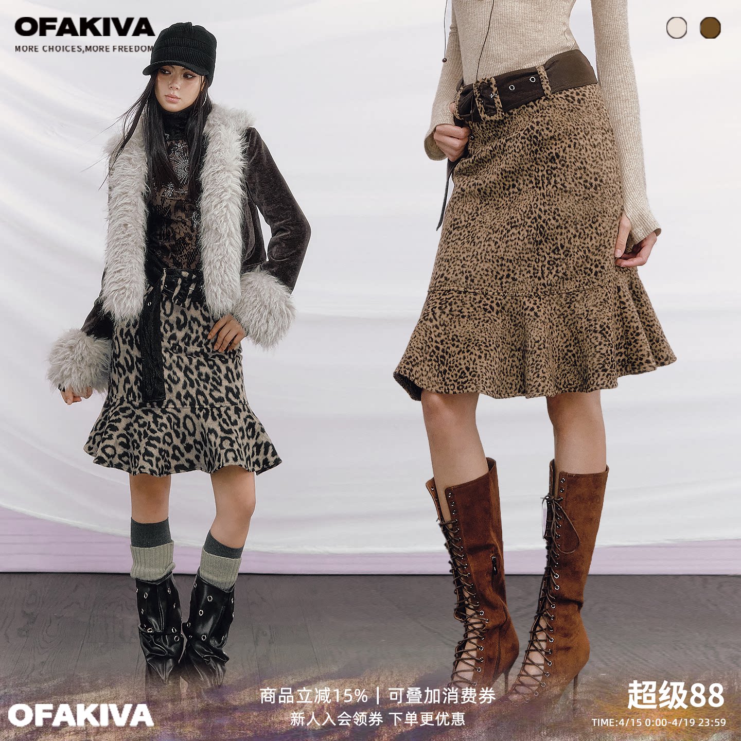 【现货】OfAkiva“昨夜暴雨”古早辣妹豹纹拼接A字秋冬毛呢半身裙
