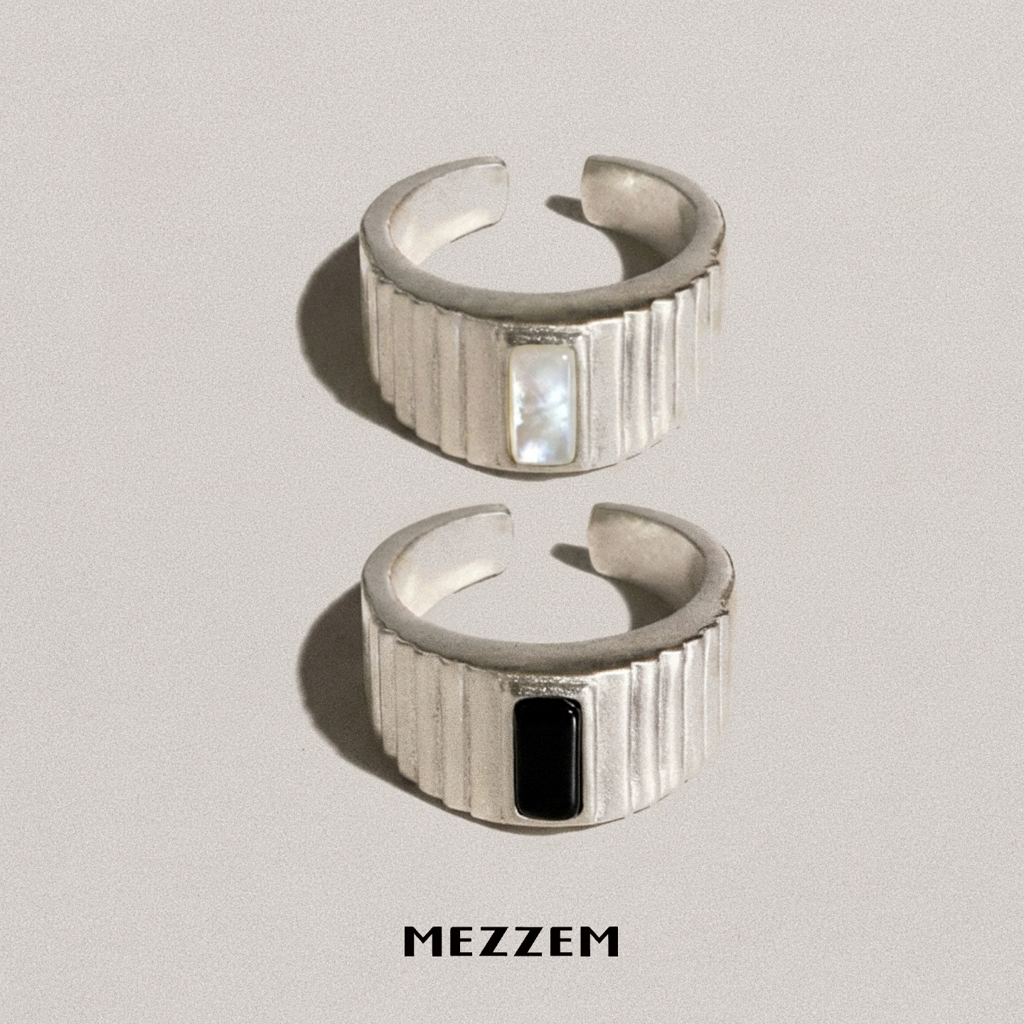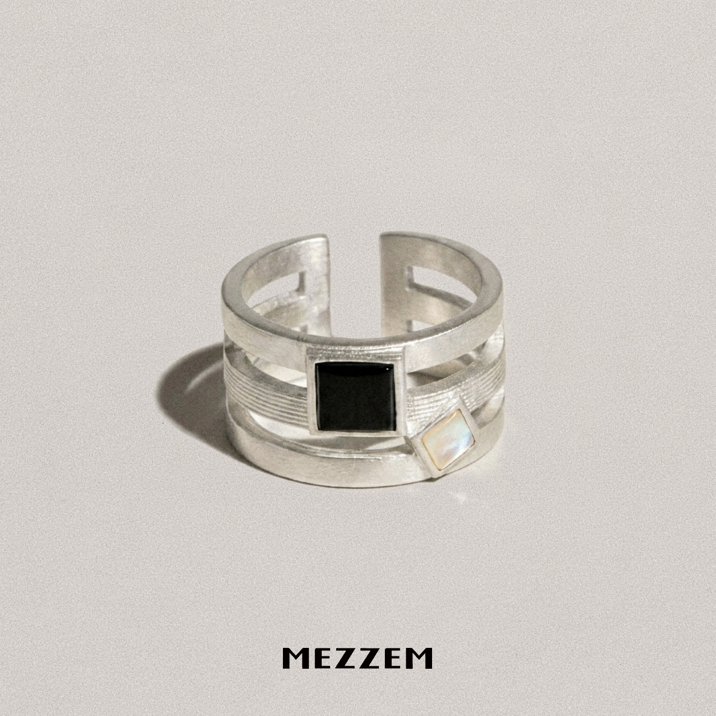 MEZZEM方切贝母黑玛瑙宽戒指银开口复古个性小众中性潮流高级感