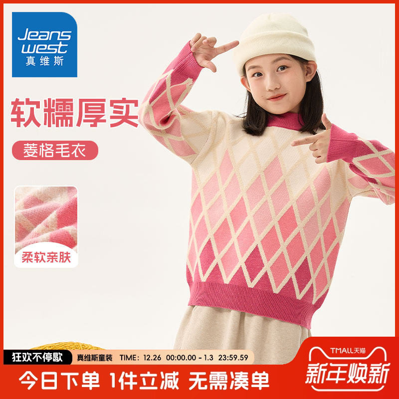 真维斯童装女童毛衣春秋款儿童2025新款菱格毛线衣女孩冬季针织衫