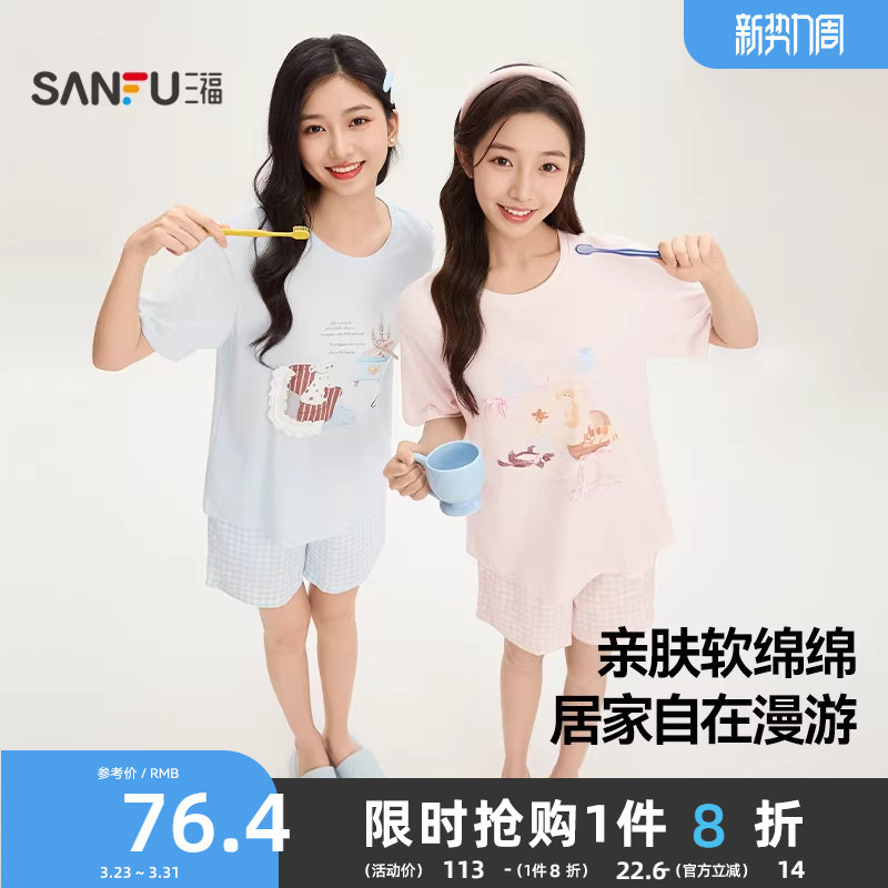 三福抗菌睡衣女款春夏季雪花棉甜美印花家居服套装可外穿短袖短裤
