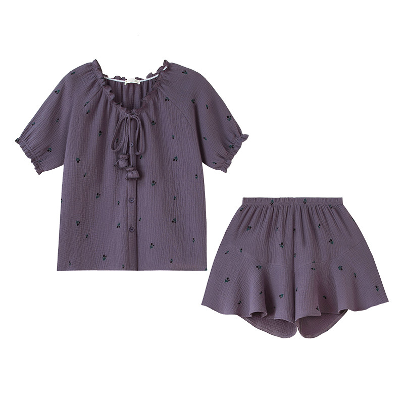 妮狄娅睡衣女夏纯棉纱布短袖郁金香田园风紫色少女短裤家居服套装
