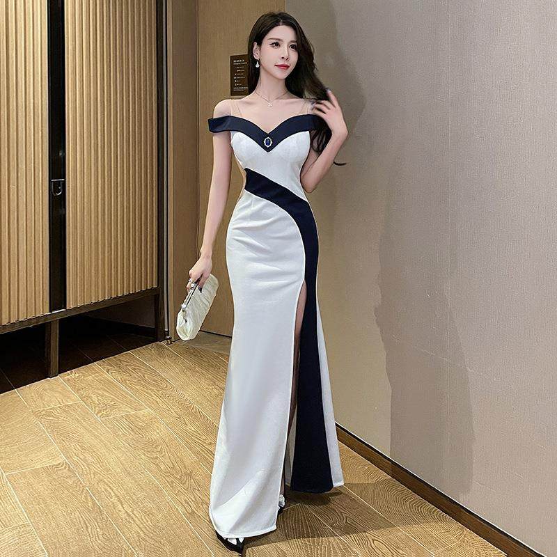 一字领开叉性感夜店连衣裙女主持人颁奖礼仪小姐舞会宴会晚礼服裙