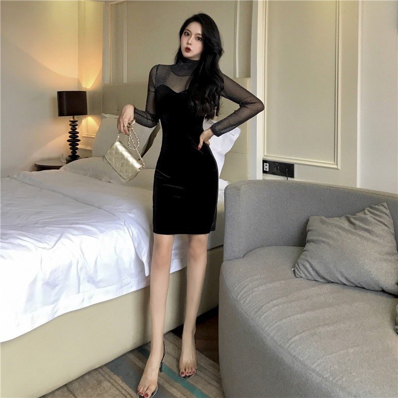 夏安若跨境辣妹性感夜店连衣裙 名媛网纱拼接v领丝绒包臀打底洋装