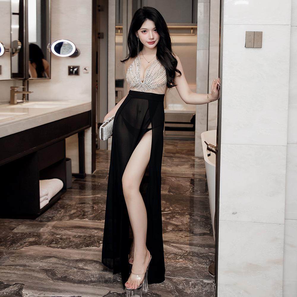 高开叉长裙紧身裙夜店连衣裙老婆裙性感超薄女透明ktv公主户外裙