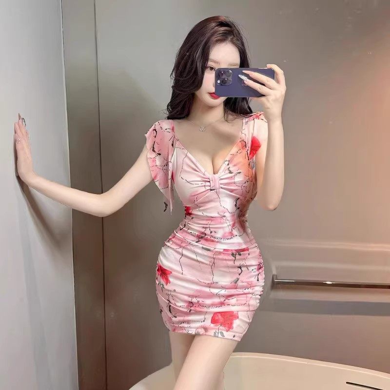 夜店女装v领低胸性感连衣裙短款夏收腰修身显瘦漏胸包臀裙鱼尾裙