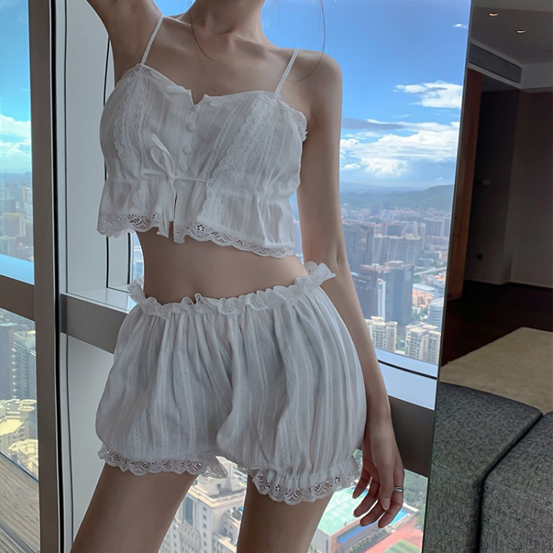 夏季少女居家服抹胸吊带薄款复古纯色网红可爱休闲纯棉睡衣两件套