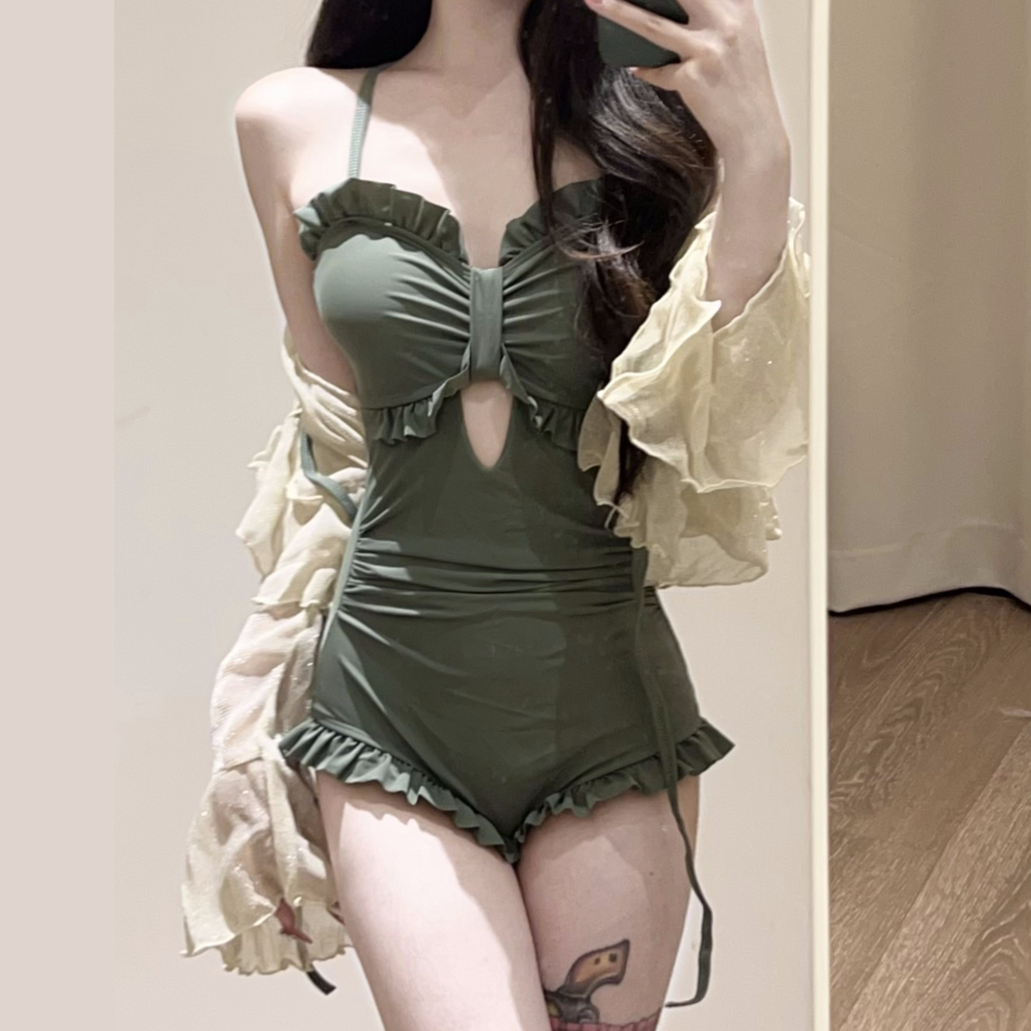 温泉泳衣女白色比基尼套装长袖罩衫荷叶裙小胸纯欲海边度假风氛围