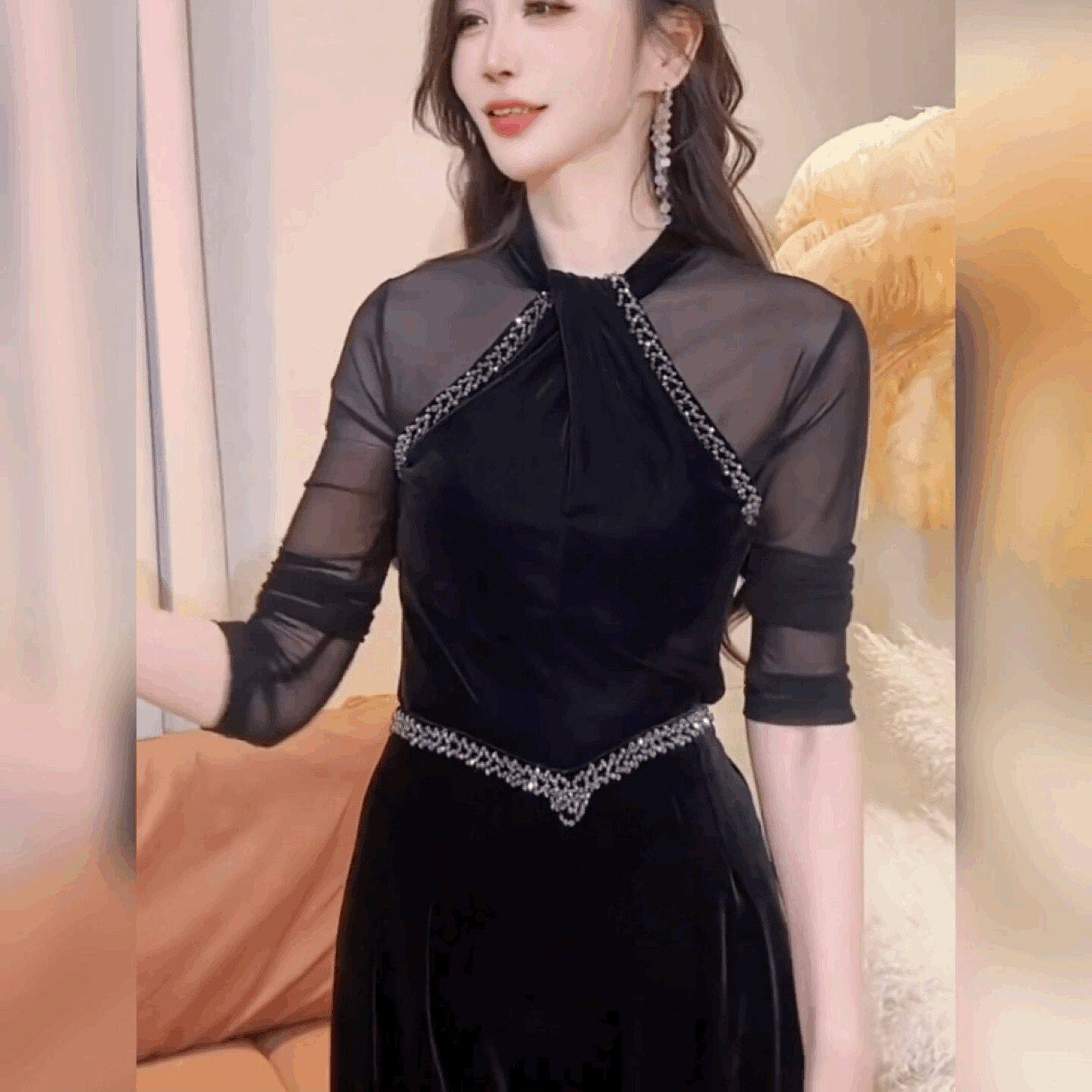 高级感纯欲网纱拼接金丝绒上衣半高领烫钻长袖打底衫性感修身T恤