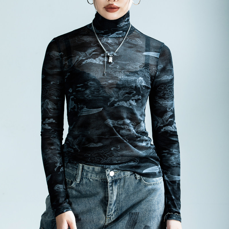 高领印花长袖洋气打底衫女2026春季新款内搭透视性感修身T恤上衣
