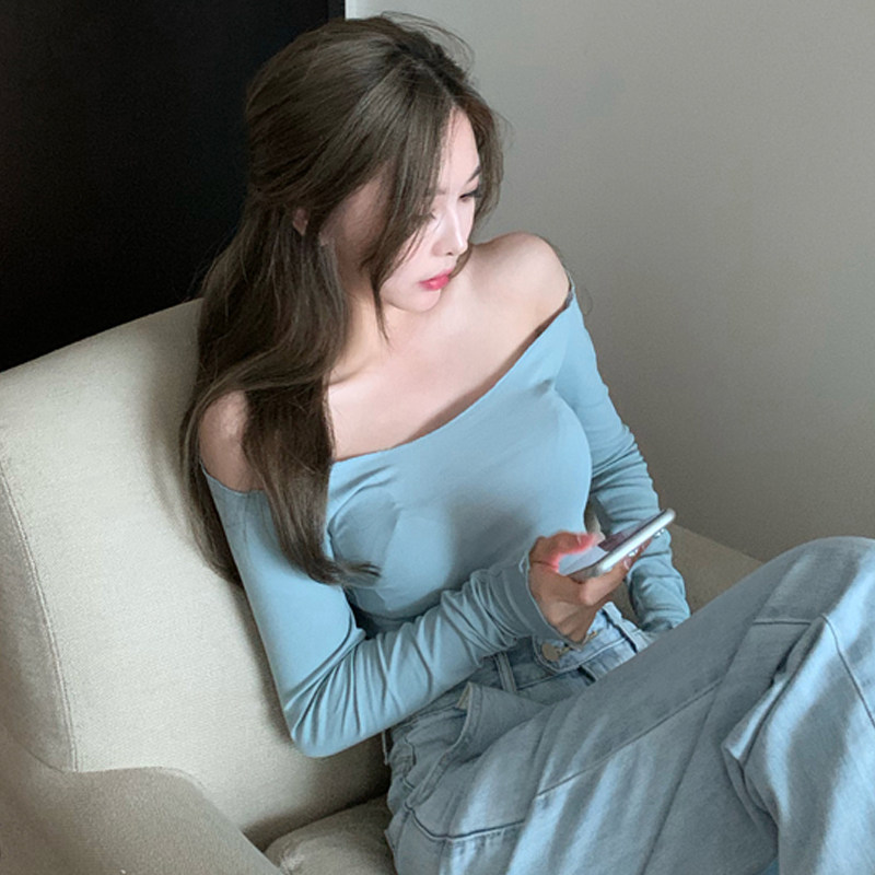 值得入~韩版纯欲小心机性感斜肩长袖T恤秋冬时髦修身弹力打底上衣