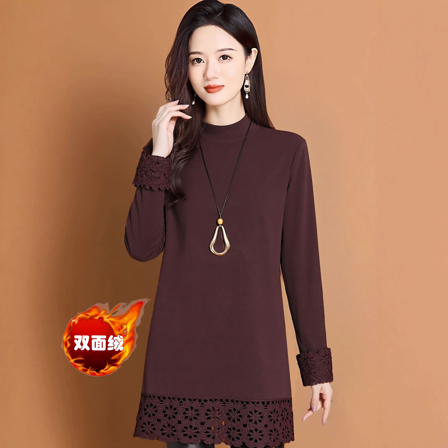 妈妈秋冬通勤风蕾丝花边双面德绒长袖T恤时尚女修身中长款打底衫